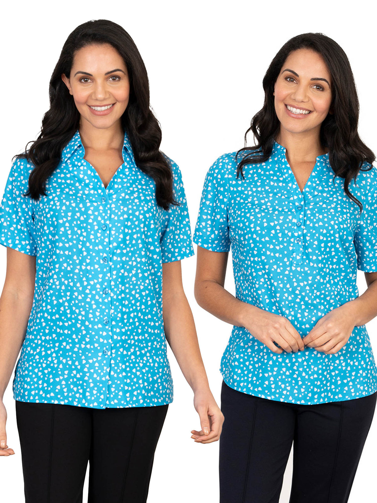 Bella printed soft touch pop-over top, when teamed with the Orla blouse creates a professional uniformed look.
