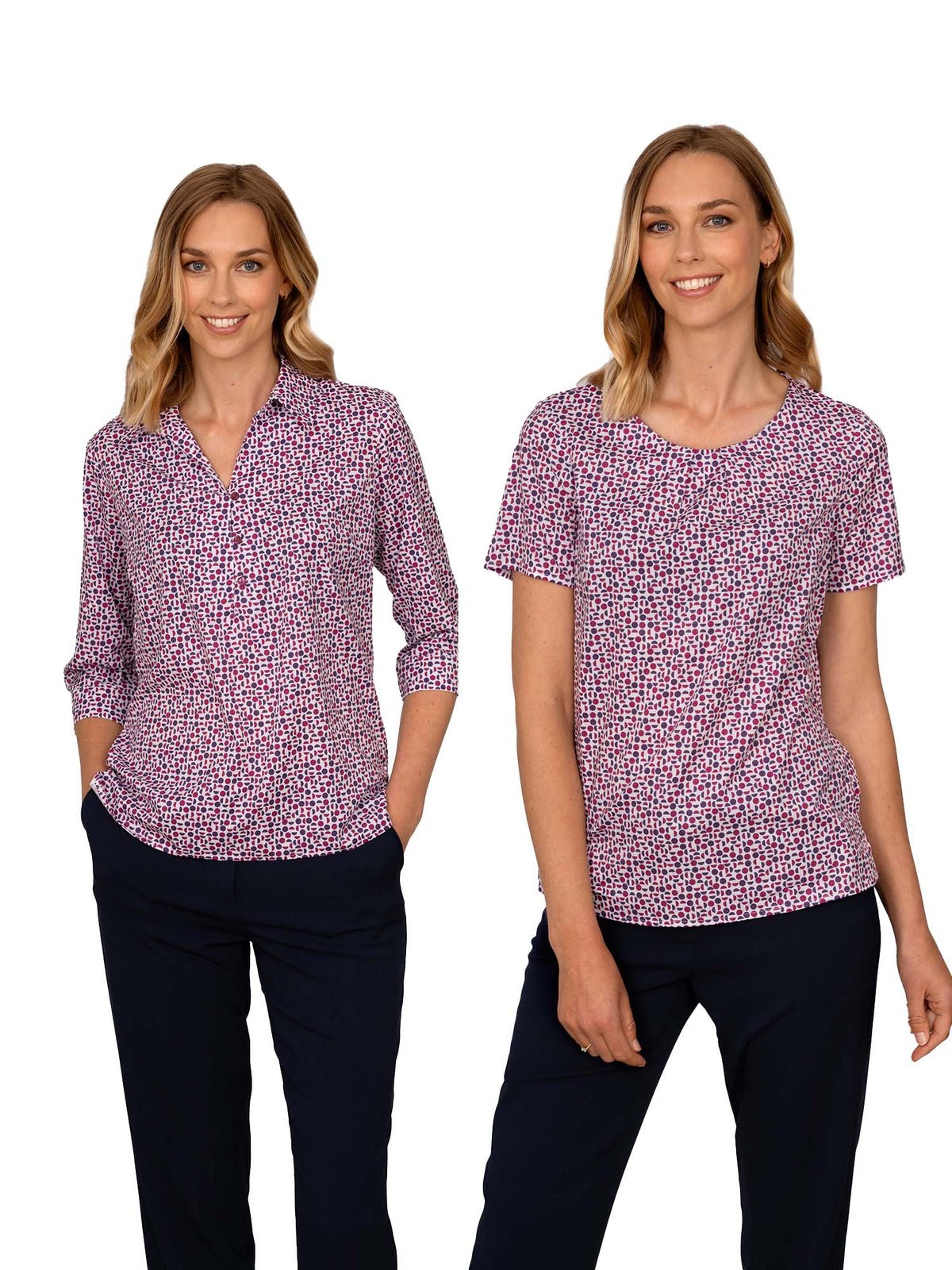 The Izzy is a striking geo print 3/4 sleeve top with open neck collar and 3-button detail made in a soft-touch fabric. This easy wear popover top is great for everyday comfort and can be teamed with it's counterpart Isla, for a uniformed look!