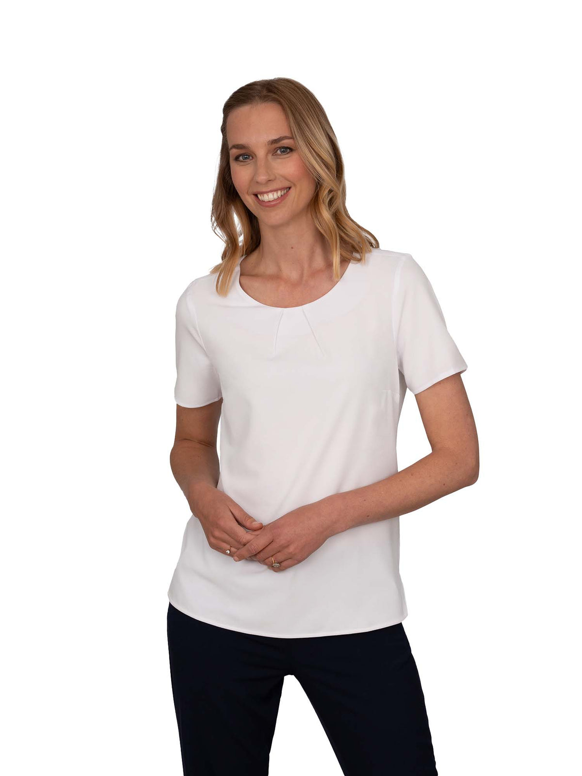 LIBBY WHITE TUCK NECK SHORT SLEEVE