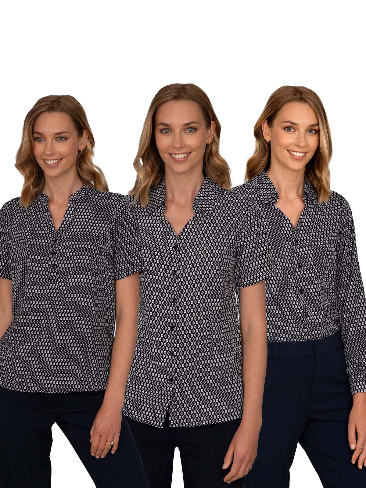 Beth printed soft touch crepe pop-over top, when teamed with the Emma blouse create a professional uniformed look.
